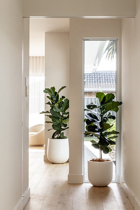 With a relaxed coastal aesthetic and generous natural light, the space called for height, softness and natural texture. We selected Fiddle Leaf Figs, Kentia Palms and sculptural Strelitzias to introduce scale and movement while maintaining a refined, neutral palette.